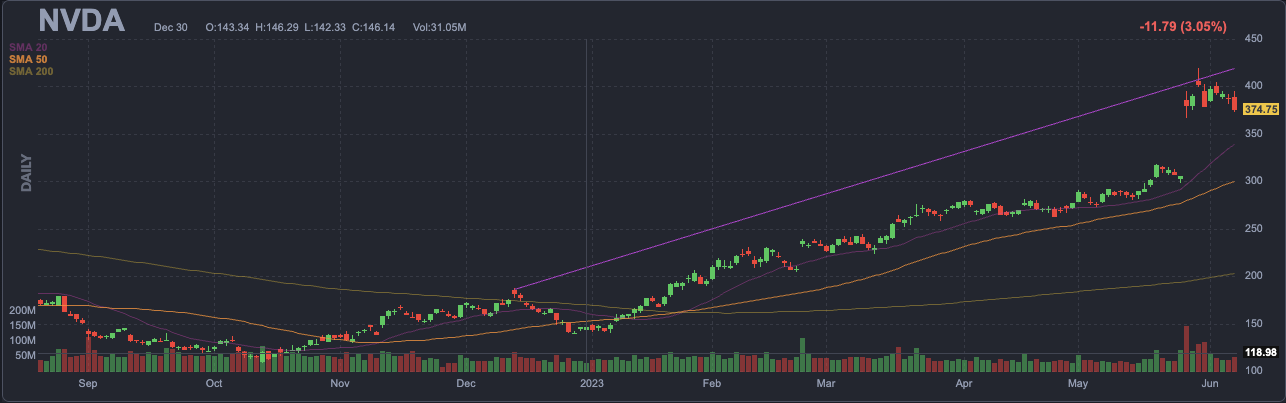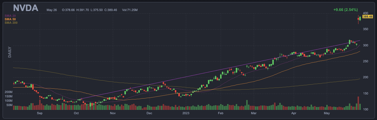 5/28/2023 엔비디아 차트 5/28/2023 기준으로 엔비디아의 RSI14 지수는 83.7을 기록하고 있었다. Nvidia 주식은 과평가된 상태였다. 뛰어난 실적을 발표하기 이전과 비교하여도 여전히 과평가된 상태였다. 실적 발표 이전 향후 12개월 이익대비주가수익률은 P/E 70배였고 실적 발표 이후에는 이익대비주가수익률은 P/E 42.3배로 조정 하락했으나, 여전히 이 수치는 여전히 주가가 실적대비 고평가된 심하게 된 상태임을 알 수 있다.
